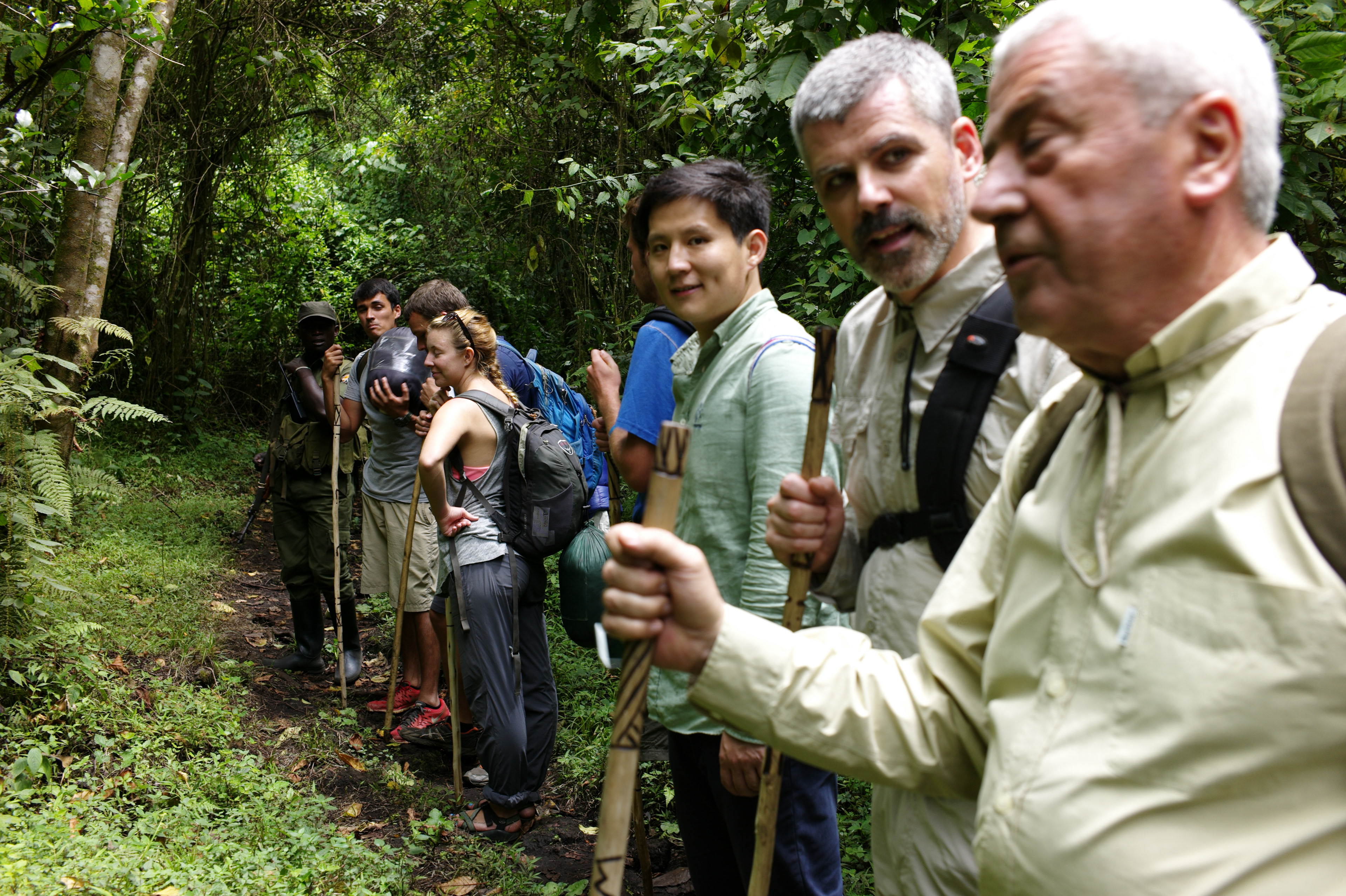 Chide waited at the trailhead until I disappeared in the forest of Virunga National Park. The trail has 4 stops, the 5th stop is the camp on top. Between every stop you walk around 40-45 minutes and then you have a break for 15-20 minutes. In total you climb around 1500 meters in altitude change and walk 8 kilometers. Our small group was accompanied by two rangers. Both had a Kalashnikow for security reasons.